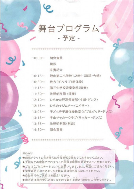 体育館では殿二小学校の1.2年生による群読・合唱から始まり、新体操の枚方RGクラブさん、第三中学校の吹奏学部と、さまざまな子供たちの披露がありました。グランドでは各種食べ物やゲームコーナー、モンキーブリッジなど例年恒例の出店がされていました。また、午後からはグランドの演台にてひらかた肝高倶楽部にはじまり、学校の体育館などで活動する団体の発表の機会となりました。