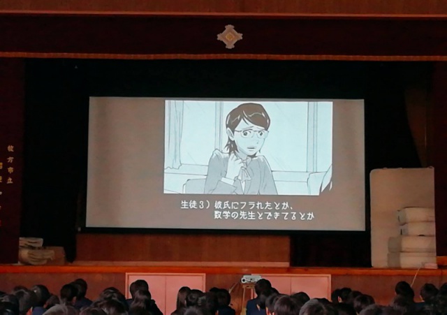 教室は、事例ごとに周囲の人と話し合いをする形式で進行しており、中学生にとっても入りやすい内容でした。生徒たちも当初は恥ずかしがったりしていたものの、議論したりする場面では各所から話し声が聞こえたり、場面場面では集中して見入っていたりの様子がうかがえ、生徒のネットリテラシーを高めるいい機会になったと思います。