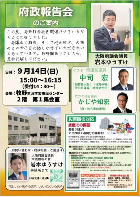 本日14日15時~、牧野生涯学習センターで府政報告会をやります。中司代議士、かじや枚方市議もゲストでお越しいただく予定です(センター前に駐車場あり)ぜひお越しください!