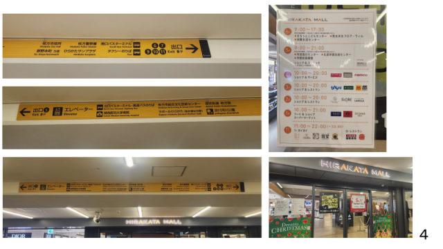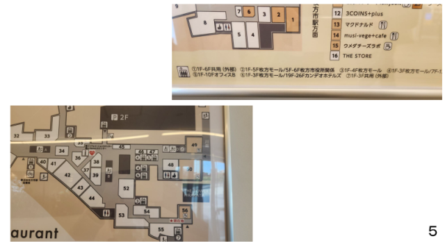 駅から約400メートル近くなり、また周知に取り組み、場所についてもお知らせをしているということでしたが、実際のところ移転から1年たっても分かりづらいという声が私のところにも届いています。(パネル2)これが外からみた府民センターなのですが、(パネル3)以前と違って外からは府民センターとは全くわからないですし、(パネル4)実際に駅から歩いてみましたが、改札を出てなかなか府民センターの案内が見当たらず、枚方モールの中でもオフィスビルの表示がないため、歩き続けることになりました。(パネル5)フロアマップや各種サインにも府民センターの文字はありませんでした。フロアマップにあるように、複数エレベーターがあるのですが、この中から府民センターに行けるのは1台だけとなっています。
