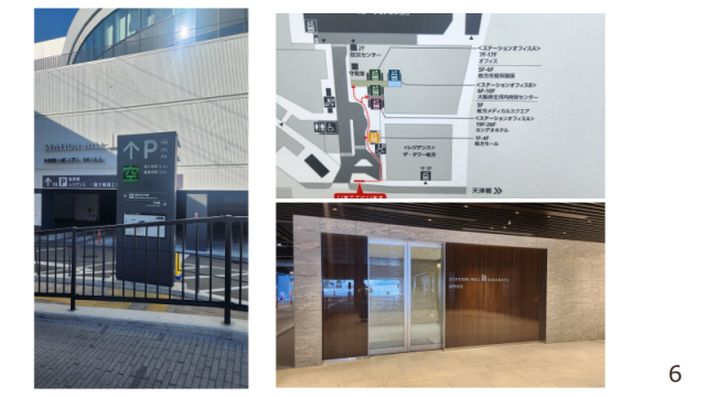 (パネル6)外に出て、ホテル・駐車場の入り口の看板で案内表示として府民センターを見つけることができました。