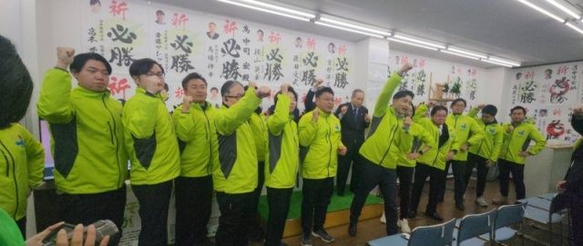 選挙はゴールではなくスタート。大阪府知事・大阪市長も再選が当選が確実視される中で、これから国政も府政も大きな節目を迎えることになります。また、今年来年には交野市長・大阪府議会・大阪府知事・枚方市議会・枚方市長・交野市議と地元に関係する選挙が控えていることから、こうしたことを踏まえ気を引き締めていこうということで、私の音頭で、ガンバローコールをさせてもらいました。