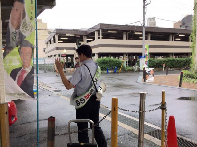 伏見さんは熱い思いを訴え、小生は隣でとにかくチラシ配りに注力。